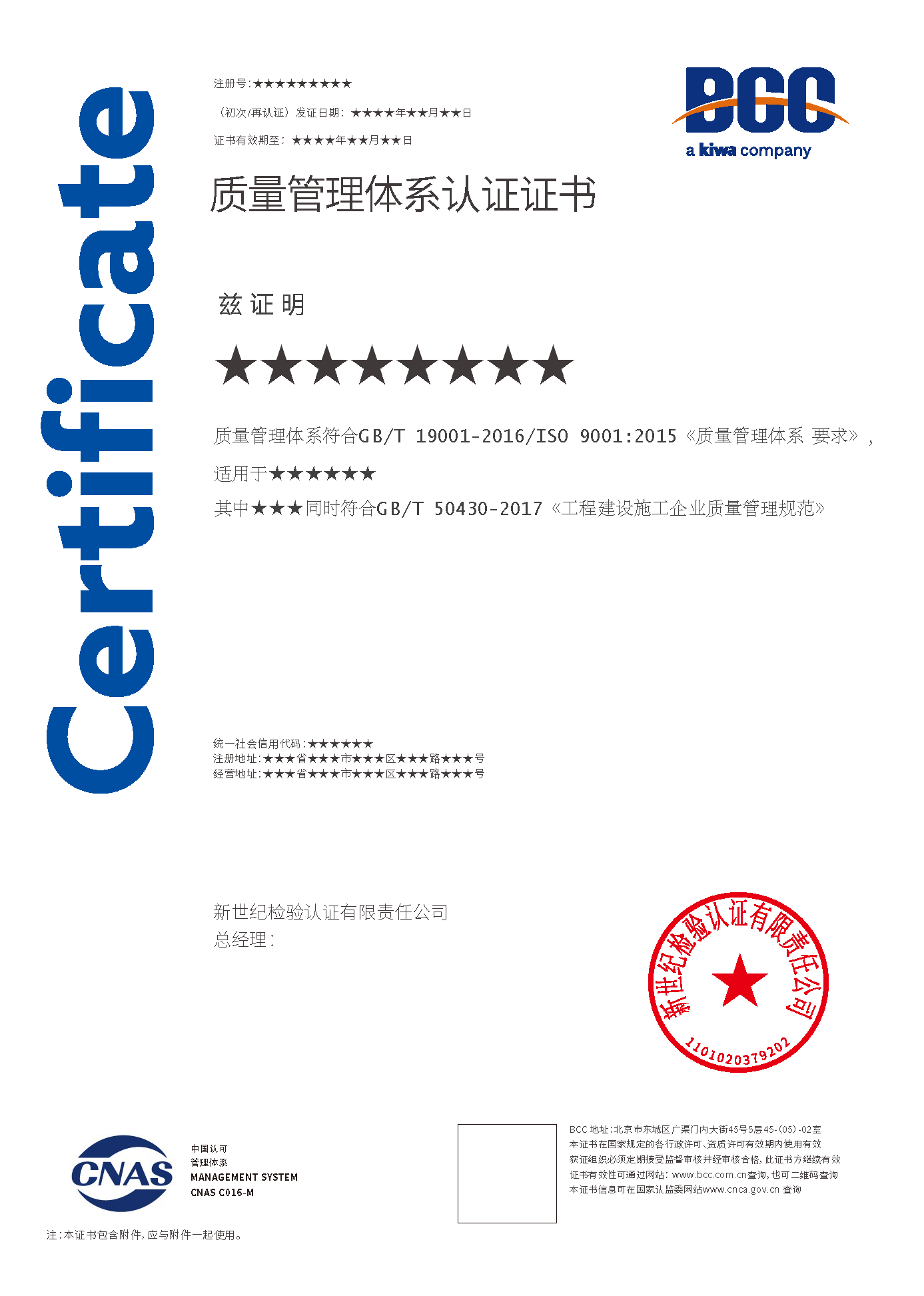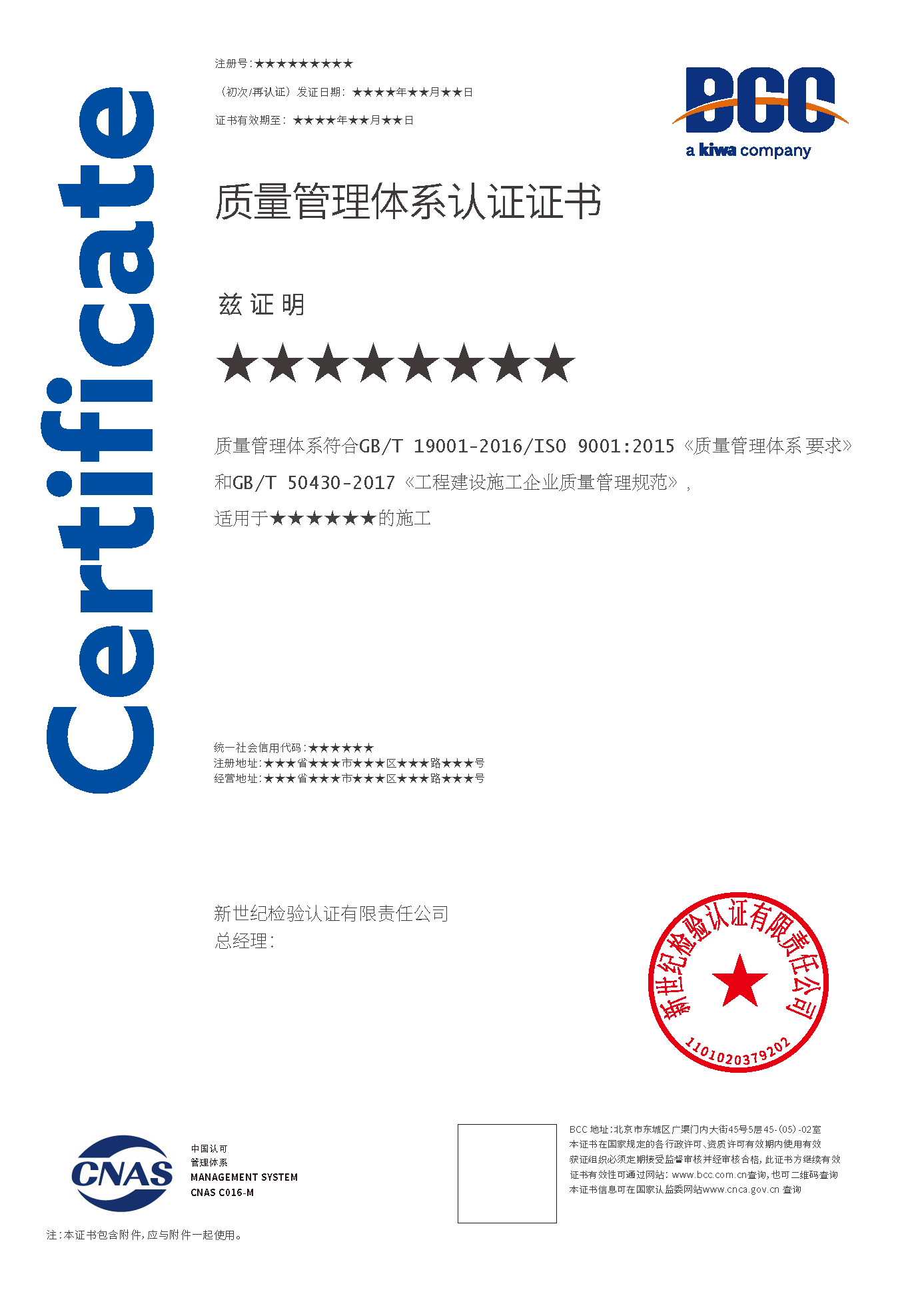 工程建設(shè)施工企業(yè)質(zhì)量管理體系認(rèn)證適用于建設(shè)施工單位(住建部頒發(fā)資質(zhì)的施工企業(yè)),既可以用于施工總承包的單位,如:建筑工程、市政公用工程、電力工程、公路工程、鐵路工程、機(jī)電工程等;此外,還可用于專(zhuān)業(yè)承包的單位,如:防水防腐保溫工程、建筑裝修裝飾工程、消防設(shè)施工程、建筑幕墻工程、電子與智能化工程、建筑機(jī)電安裝工程、環(huán)保工程、鋼結(jié)構(gòu)工程等。