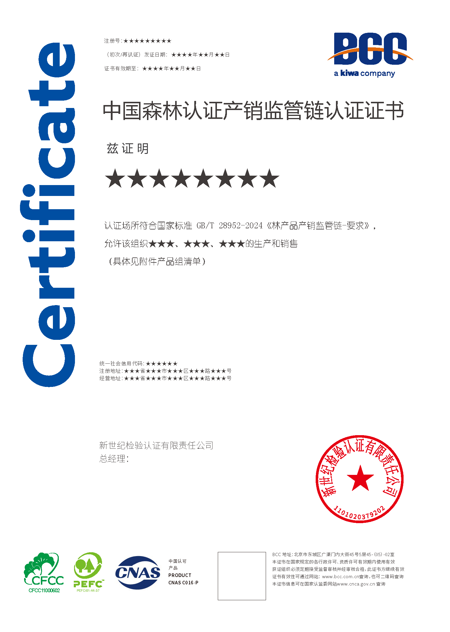 Kiwa BCC已經(jīng)獲得英國(guó)土壤協(xié)會(huì)SA授權(quán),可在中國(guó)開(kāi)展FSC®產(chǎn)銷監(jiān)管鏈認(rèn)證(FSC® N001893)和PEFC產(chǎn)銷監(jiān)管鏈認(rèn)證。同時(shí),可為組織提供CFCC產(chǎn)銷監(jiān)管鏈認(rèn)證服務(wù)。
