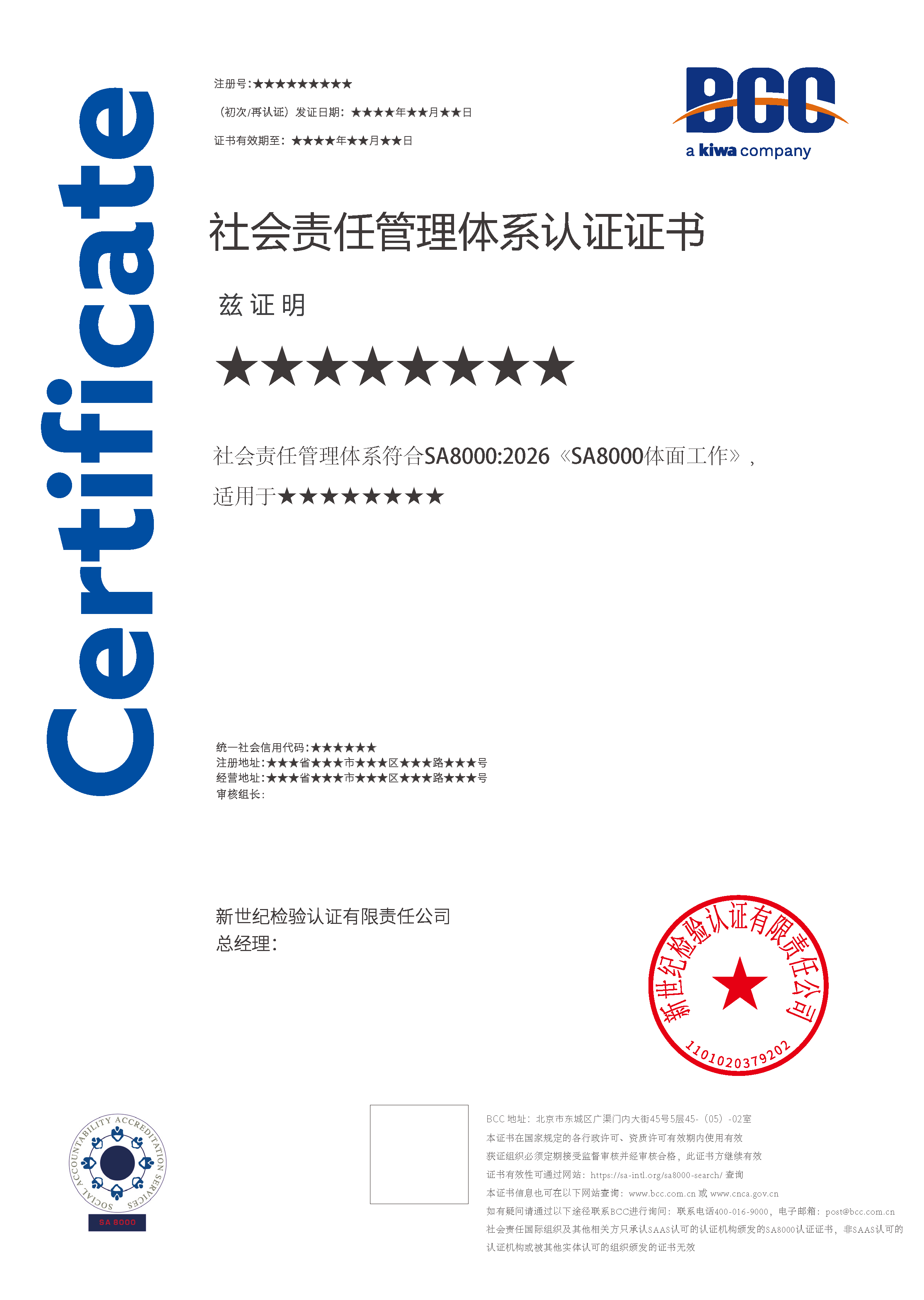 現(xiàn)行SA8000認證使用的標準是SA8000:2014,該標準是由美國SAI(社會責任國際組織)制定發(fā)布的。SA8000標準涵蓋九個方面:童工、強迫勞動、健康與安全、結(jié)社自由及集體談判的權(quán)利、歧視、懲罰措施、工作時間、報酬和管理體系。