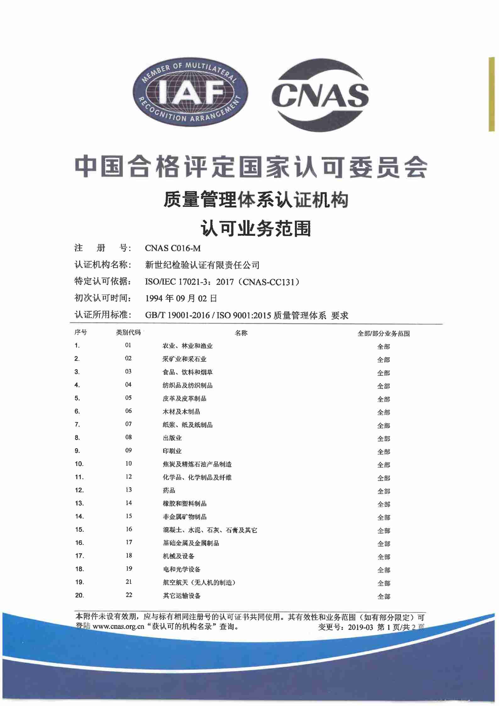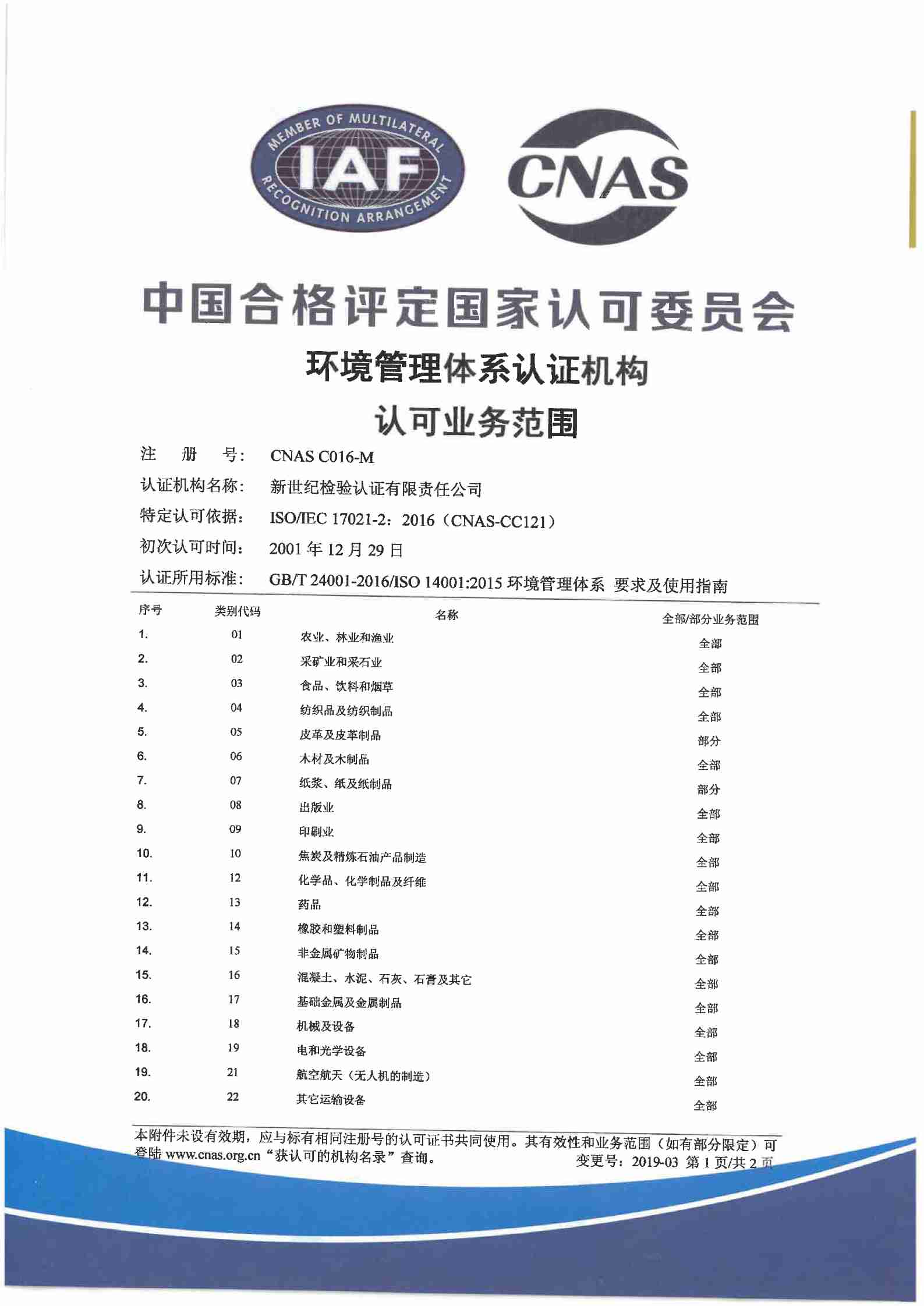 環(huán)境管理體系認(rèn)證機(jī)構(gòu)認(rèn)可證書(一) |