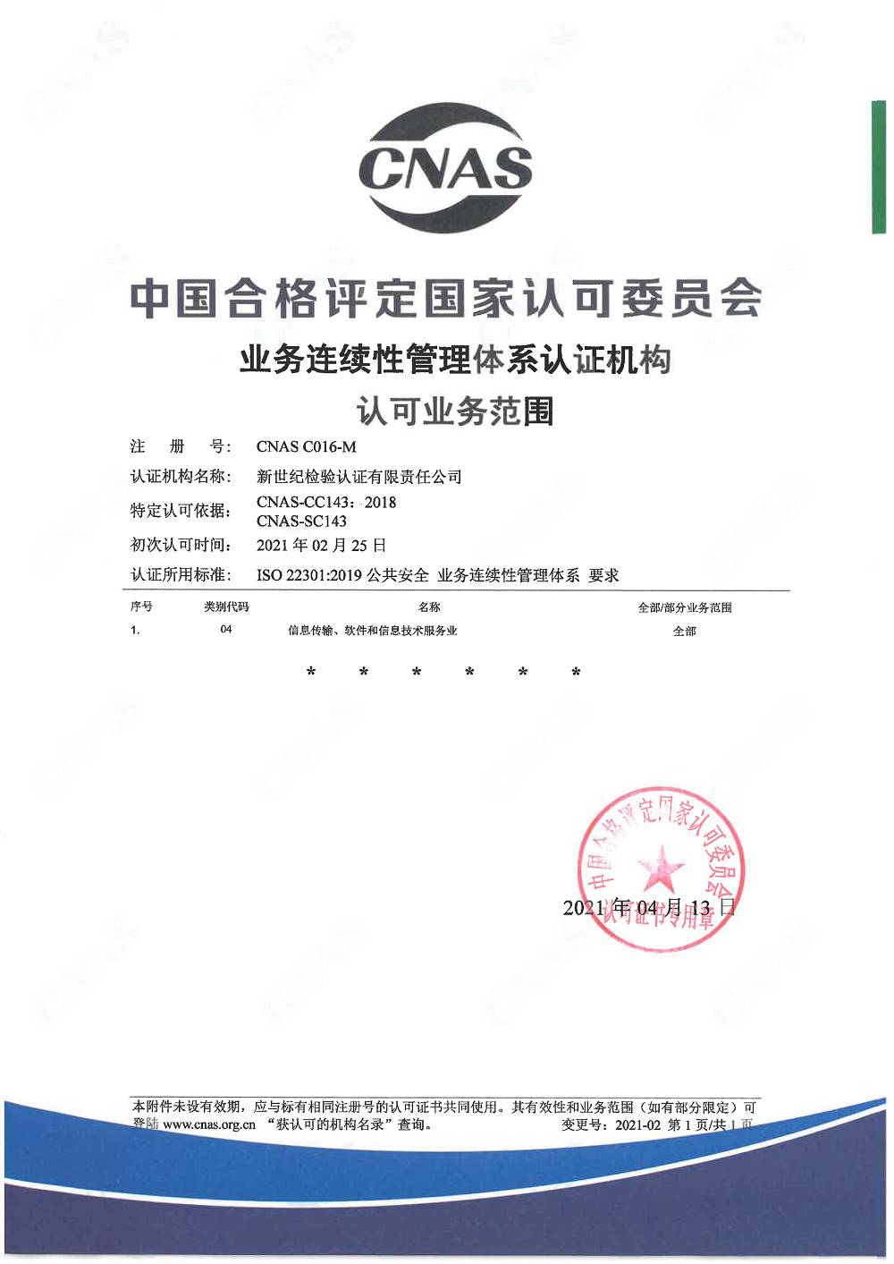 業(yè)務(wù)連續(xù)性管理體系認(rèn)證機(jī)構(gòu)認(rèn)可證書 |