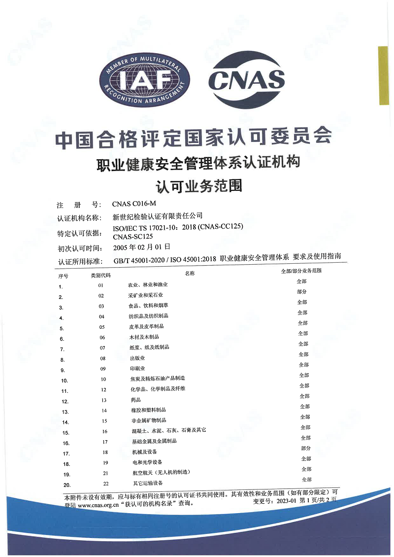 職業(yè)健康安全管理體系認(rèn)證機(jī)構(gòu)認(rèn)可證書(一) |