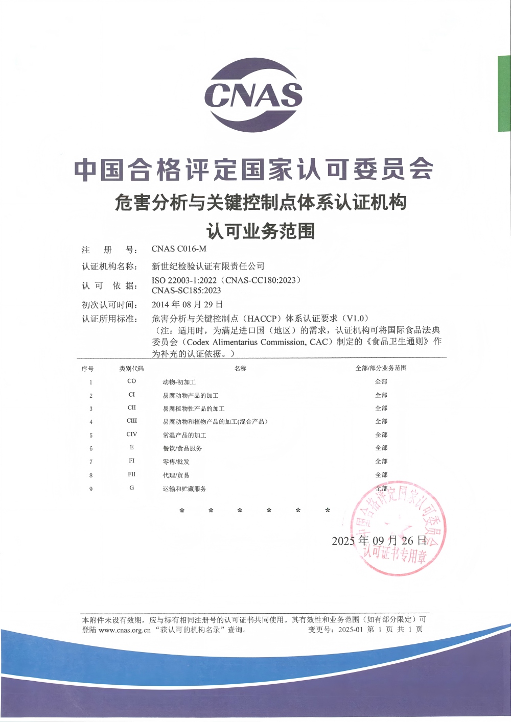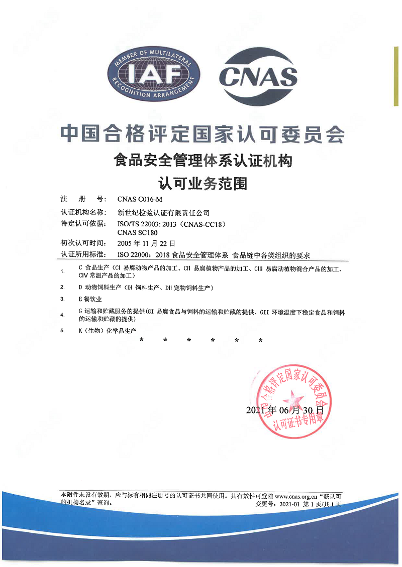 危害分析與關(guān)鍵控制點(diǎn)認(rèn)證機(jī)構(gòu)認(rèn)可證書 |