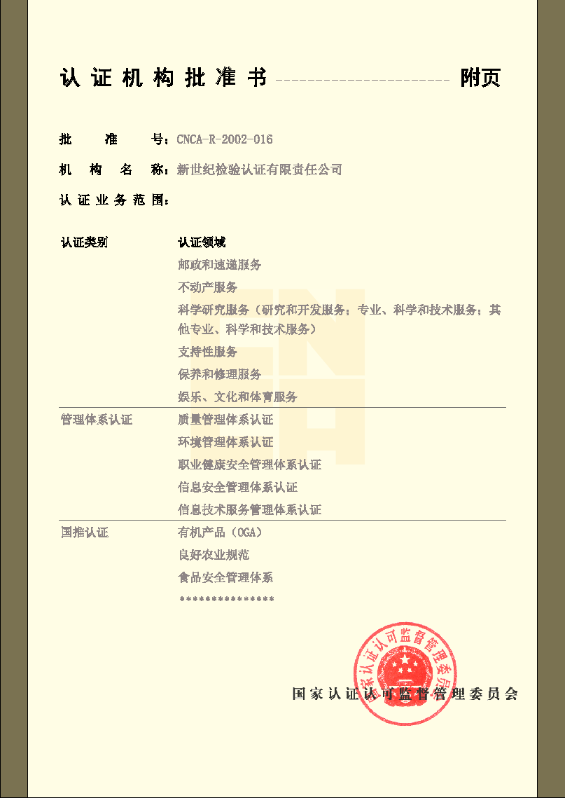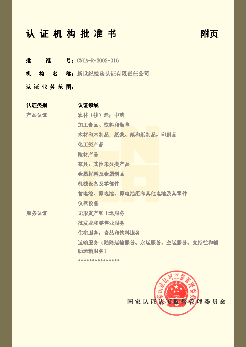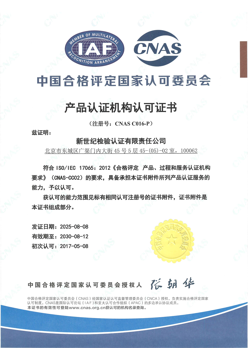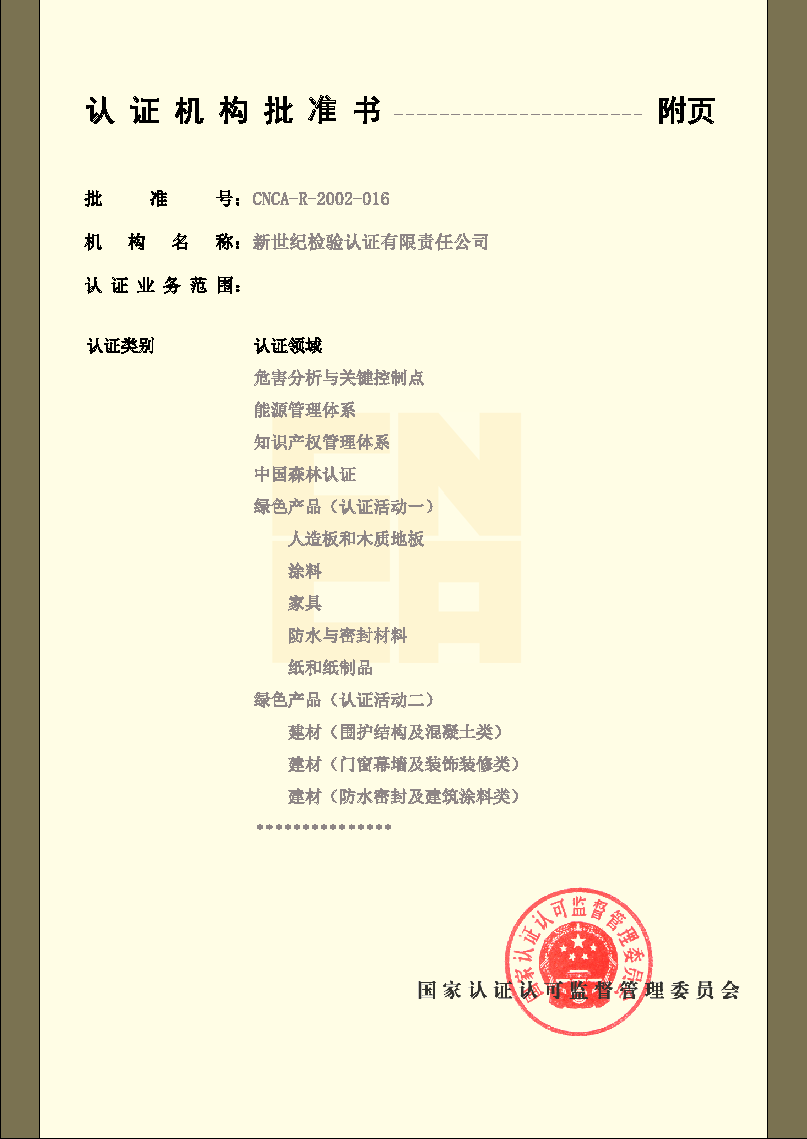 產(chǎn)品認(rèn)證機(jī)構(gòu)認(rèn)可證書 |