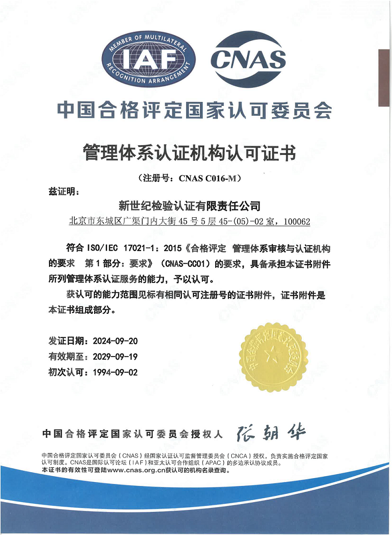 管理體系認(rèn)證機(jī)構(gòu)認(rèn)可證書 |