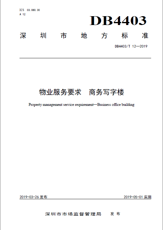 深圳市市場(chǎng)監(jiān)管局自2016年開(kāi)始籌備物業(yè)服務(wù)認(rèn)證工作,歷經(jīng)三年多,在深圳標(biāo)準(zhǔn)認(rèn)證聯(lián)盟和標(biāo)準(zhǔn)技術(shù)研究院的大力支持下,中航物業(yè)和SGS通標(biāo)標(biāo)準(zhǔn)技術(shù)服務(wù)有限公司經(jīng)過(guò)行業(yè)走訪調(diào)研、專業(yè)論證、條款編寫、標(biāo)準(zhǔn)評(píng)審,終于在2019年5月1日聯(lián)合發(fā)布了首個(gè)服務(wù)類深圳認(rèn)證標(biāo)準(zhǔn)DB 4403/T 12—2019《物業(yè)服務(wù)要求 商務(wù)寫字樓》,標(biāo)準(zhǔn)引入了先進(jìn)的服務(wù)接觸理論和服務(wù)質(zhì)量評(píng)價(jià)模型,從客戶感知和企業(yè)自身管理兩個(gè)角度提出服務(wù)要求和管理要求,結(jié)合深圳市商務(wù)寫字樓的先進(jìn)技術(shù)和先進(jìn)方法,具有較強(qiáng)的科學(xué)性和適用性,達(dá)到了國(guó)內(nèi)領(lǐng)先、國(guó)際一流水平。認(rèn)證按照深圳標(biāo)準(zhǔn)認(rèn)證聯(lián)盟發(fā)布的首個(gè)服務(wù)認(rèn)證實(shí)施規(guī)則實(shí)施。