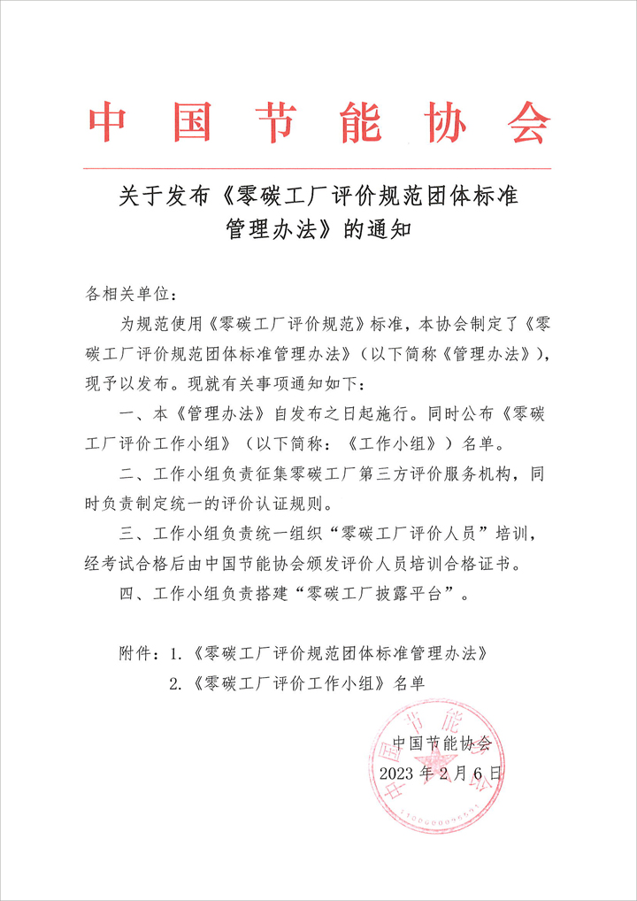 關(guān)于發(fā)布《零碳工廠評價(jià)規(guī)范團(tuán)體標(biāo)準(zhǔn)管理辦法》的通知