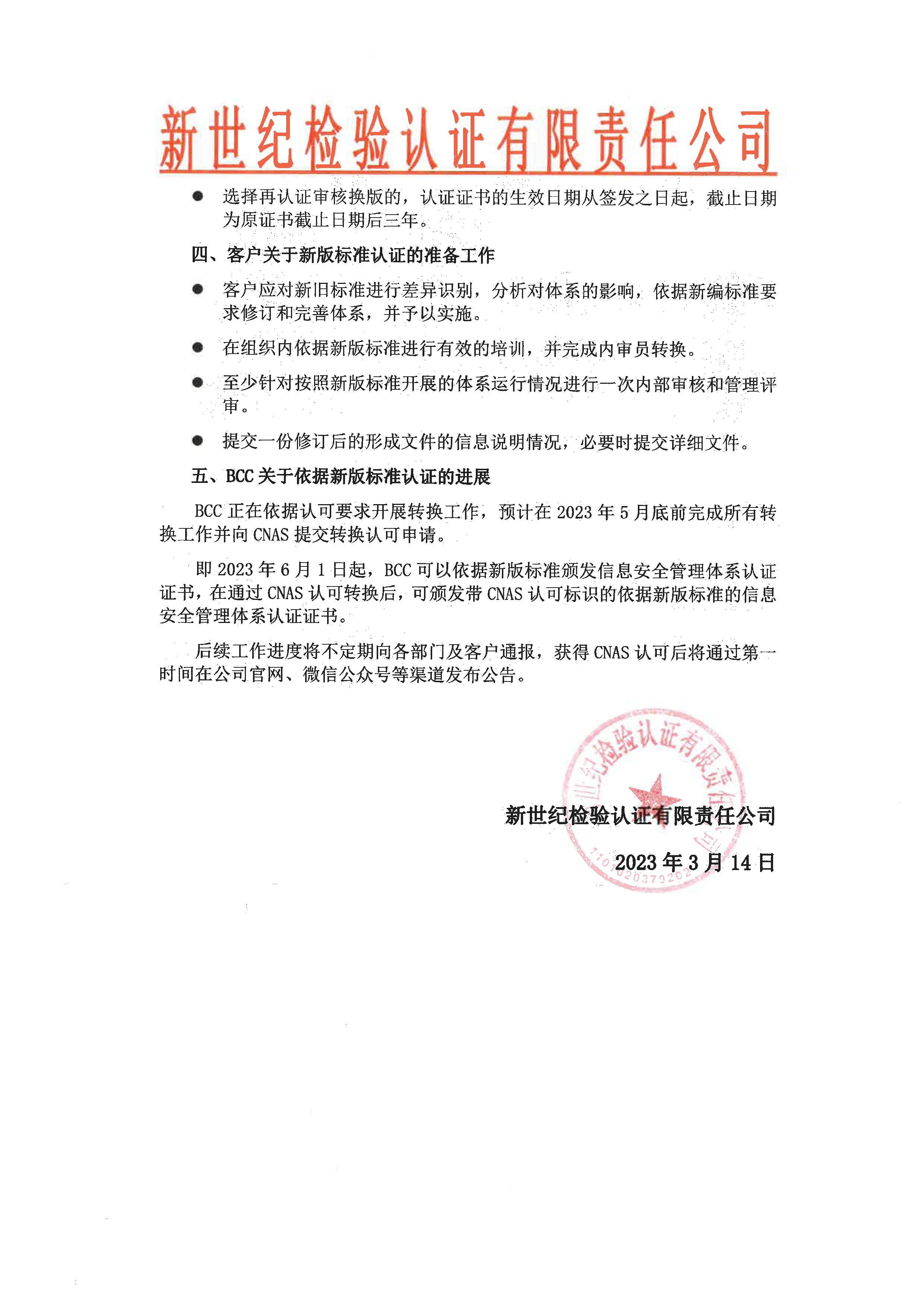 關于信息安全管理體系認證標準轉(zhuǎn)換安排的告客戶書
