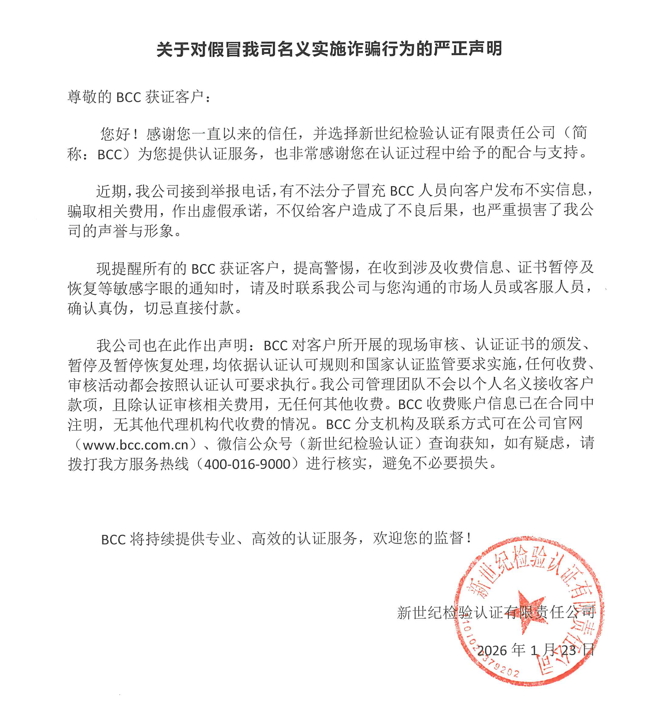 我公司也在此作出聲明:BCC對客戶所開展的現(xiàn)場審核、認證證書的頒發(fā)、暫停及暫?;謴吞幚?,均依據(jù)認證認可規(guī)則和國家認證監(jiān)管要求實施,任何收費、審核活動都會按照認證認可要求執(zhí)行。我公司管理團隊不會以個人名義接收客戶款項,且除認證審核相關(guān)費用,無任何其他收費。BCC收費賬戶信息已在合同中注明,無其他代理機構(gòu)代收費的情況。BCC分支機構(gòu)及聯(lián)系方式可在公司官網(wǎng)(www.xcbanjx.com)、微信公眾號(新世紀檢驗認證)查詢獲知,如有疑慮,請撥打我方服務(wù)熱線(400-016-9000)進行核實,避免不必要損失。