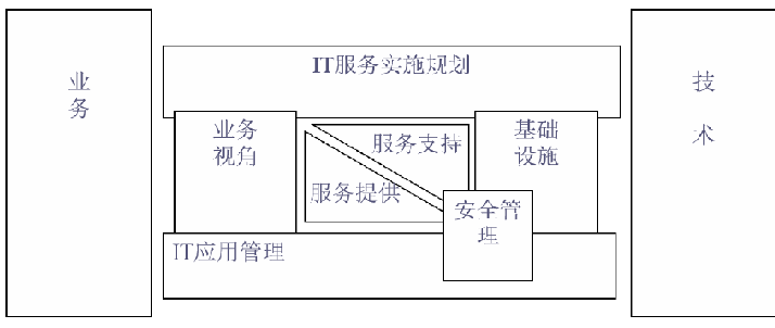 IT 服務實施規(guī)劃處于整個結(jié)構(gòu)的最高層,功能是對框架內(nèi) 6 大模塊開展各項工作進行指導,幫助用戶分析現(xiàn)有情況,協(xié)助設定發(fā)展戰(zhàn)略與目標,同時在實踐中對完成的工作進行評測,給出調(diào)整意見。